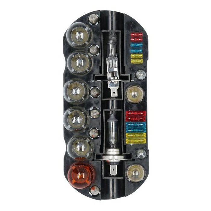 Carpoint 30-delt reservelampesæt H1/H7 er et meget omfattende sæt med 18 lamper og 12 sikringer. Sættet består af følgende lamper med E-mærke: