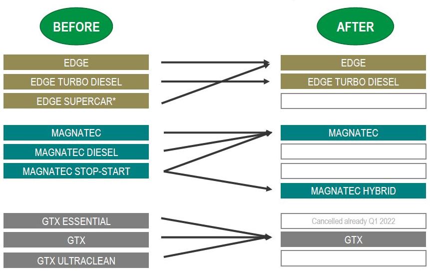 | 2. september 2023 Castrol gennemfører stor ændring af logo og emballageSom et led i en mere bæredygtig fremtid, ændrer Castrol alle sine mindre emballager (0,5, 1, 4 og 5 liter dunke) til størrelser der fylder mindre. Det betyder fx at der ikke længere vil være to håndtag på 4 og 5 liters dunkene og at alle dunke strømline på en måde så de bliver lettere, der indgår mindre plast i hver dunk og de forpakningsmæssigt optimeres, så de fylder mindre i forsendelse. For dig som kunde får dette ikke den store betydning, vi vil hos RundtOmBilen ApS stadig lagerføre alle de Castrol produkter som vi plejer. I løber af ca. 1 år fra skrivende stund skulle alle emballager være skiftet og vores lager opdateret med den nye dunke.Olierne ændres ikkeDet er vigtigt at understrege, at selvom Castrol gennemfører store ændringer på udseendet, skifter olierne ikke! Du kan stadig købe alle de kendte olier, nogle vil dog få nye navne, da Castrol samtidig "rydder op" i sine brands (der er dog to undtagelser; Magnatec Diesel 10W-40 B4 og Magnatec Stop-Start 0W20 GF udgår). Alle etiketter ændres, hvilket nok vil kræve lidt tilvænning, vi vil løbende sørge for nye billeder af produkterne i shoppen. Ændringerne kan ses i detaljer nederst, men i hovedtræk er de vigtigste ændringer:EDGE: Castrol Edge Titanium og Edge Fluid Titanium udgår som produktnavne og bliver til Castrol Edge MAGNATEC: Magnatec Diesel og Magnatec Stop-Start bliver til Magnatec GTX: GTX Ultraclean bliver til GTX |
