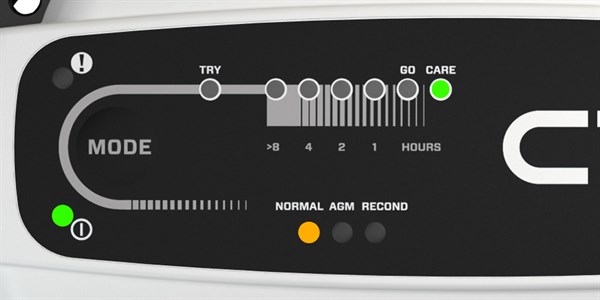 FIND UD AF DET CTEK TIME TO GO opladeren har en anden indfaldsvinkel på batteriopladning - den fortæller dig, hvornår dit batteri vil være klar til brug. En række LED lamper indikerer de forskellige opladningstrin og hvor længe det vil vare, inden batteriet er tilstrækkeligt opladet og klar til brug. Der findes også indikatorer, som fortæller dig, hvornår det er sikkert at PRØVE at starte dit køretøj og hvornår batteriet er klar til GO.