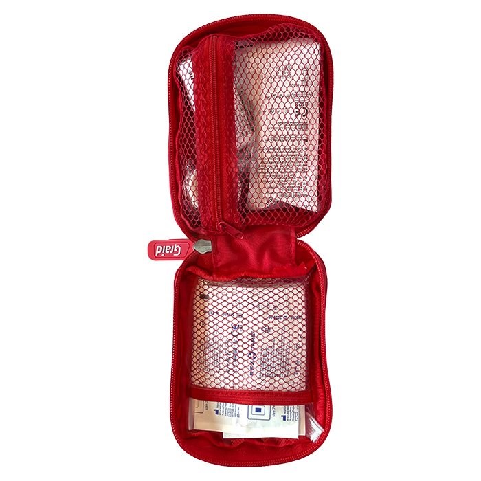 Praktisk førstehjælpstaske med alt det rigtige indhold, hvis uheldet er ude. Alt, hvad du behøver i forbindelse med lettere personskader. Tasken måler 10 × 15 cm og har en velcrostrop på bagsiden, så den kan monteres på fx et bælte.