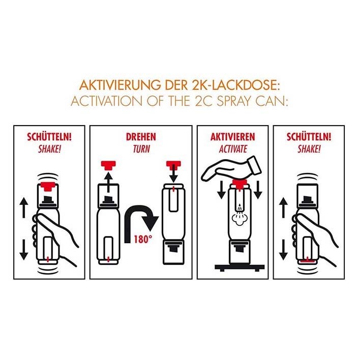 Denne universelle 2K spraymaling fra Foliatec har et innovativt 2-komponentsystem. Det betyder, at hærderen nu er placeret direkte i dåsen, så der ikke længere er behov for et besværligt blandingsarbejde. Hærderpatronen skal blot fjernes inden brug ved hjælp af trykknappen, dåsen rystes kraftigt og så er den klar til brug!
