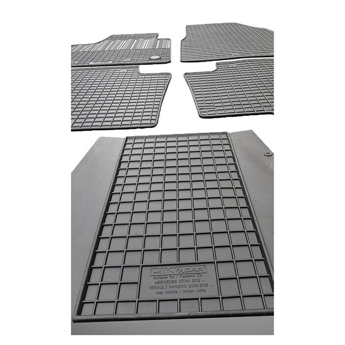 Gummimåtter til Mercedes Citan 2012-, Renault Kangoo 2008-2020 5 personer Gummimåtter er praktiske og et absolut must i vinterhalvåret. Måtterne er "skræddersyet" til den enkelte bilmodel, og har derfor 100% pasform. Den forhøjede kant gør, at måtten holder på skidt og snavs og beskytter bilens originale tæppe, samt er nem at rengøre. Hvis bilen har originale låse, vil der i måtten være fastgørelseshullerne, som sikrer, at måtterne holdes på plads i bilen.