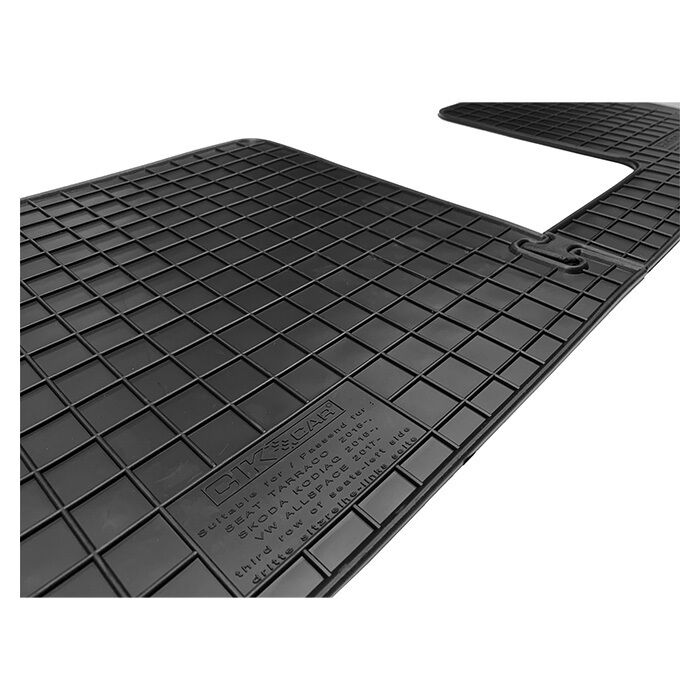 Gummimåtter til Seat Tarraco 2018-, Kodiaq 2016-, Tiguan AllSpace 2017-, 3. række Gummimåtter er praktiske og et absolut must i vinterhalvåret. Måtterne er "skræddersyet" til den enkelte bilmodel og har derfor 100% pasform. Den forhøjede kant gør, at måtten holder på skidt og snavs og beskytter bilens originale tæppe, samt er nem at rengøre. Hvis bilen har originale låse, vil der i måtten være fastgørelseshullerne, som sikrer, at måtterne holdes på plads i bilen.