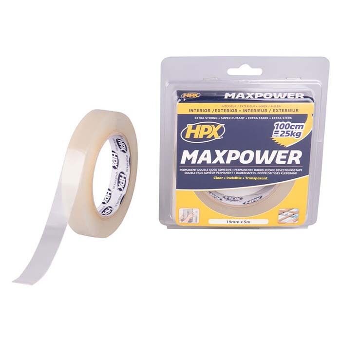 Dobbeltklæbende tape Max Power til montering af tunge genstande – 19 mm x 5 m 100% transparent dobbeltklæbende tape med høj klæbeevne. Den er meget velegnet til montering af alle typer genstande, herunder genstande med tung belastning. Det dobbeltklæbende tape klæber godt til metal, glas og de fleste plastmaterialer, og er endda modstandsdygtig over for fugt. Den udskifter skruer, blindnitter, svejsninger og flydende lim, både ved indendørs og udendørs brug.