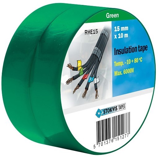 PVC Isolerbånd Grøn Den klassiske isoleringstape til brug ved f.eks. afskærmning af blottede ledningsender, eller samlinger. Ideel til samling af ledning mm. Rulle af 10m Bredde 15mm