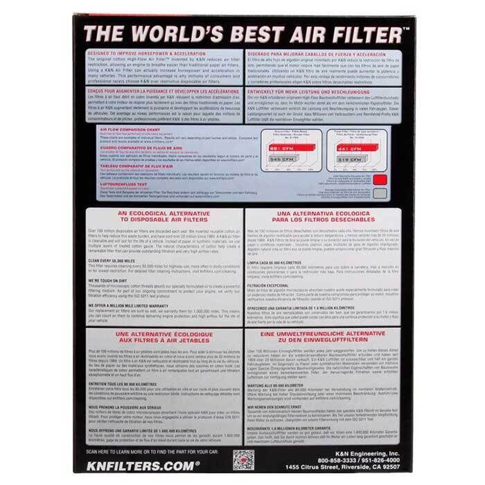 K&N vaskebart og genanvendeligt High-Flow luftfilter. Filteret er designet til at forbedre luftstrømningen og fange snavs. Hvert luftfilter er genanvendeligt og specialdesignet til at holde hele din bils levetid.