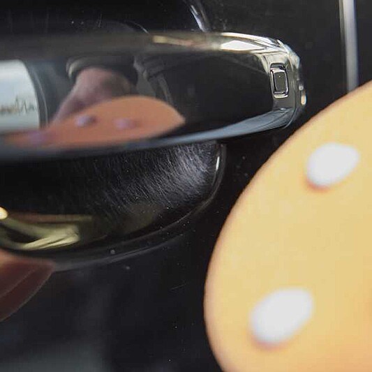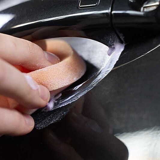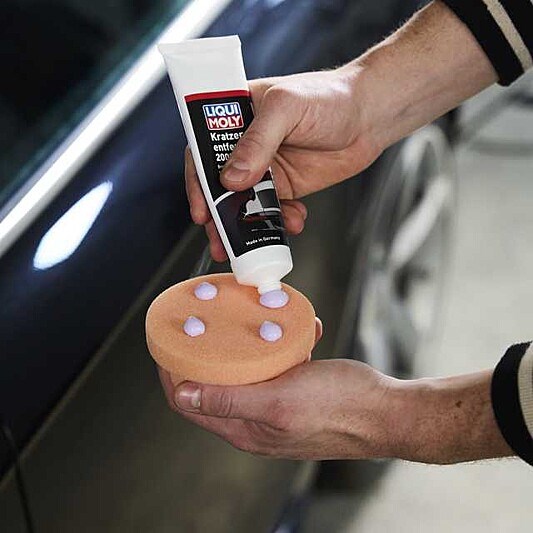 3. Kom derefter ridsefjerner 2000 på en hård svamp til manuel polering eller en mikrofiberklud eller mikrofibersvamp og påfør den i et tyndt, jævnt lag med cirkulære bevægelser. Bemærk: Vær forsigtig ved karrosseriovergange, da produktet er meget slibende!