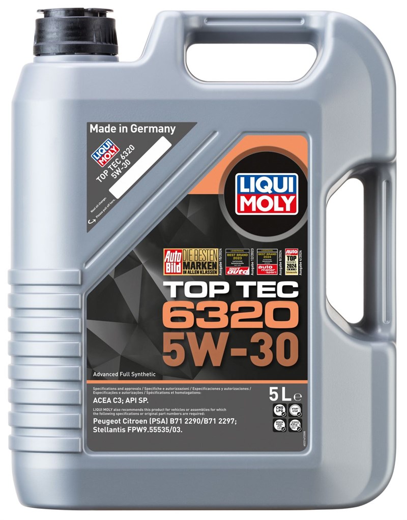 Top Tec 6320 5W-30 er primært udviklet til benzin- og dieselbiler af typen Citroën, DS, Fiat, Jeep, Opel, Peugeot og Toyota med PSA-motorer. LIQUI MOLYs nyeste motorolie er egnet til motortyper der kræver et smøremiddel med specifikationen Stellantis FPW9.55535/03, PSA B71 2290, PSA B71 2297 samt ACEA C3 og API SP.