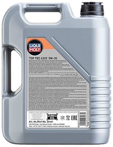 Denne Liqui Moly olie en del af Premium olierne fra tyske Liqui Moly. Olien er baseret på syntetiske additivpakker som resulterer i en moderne brændstofeffektiv olie, udviklet til brug gennem hele året til i særdeleshed biler med små højtydende motorer. Tendensen med færre kubik (ccm) har varet i nogle år og ser ud til at fortsætte, i takt med at kravene til bilernes forurening skærpes år for år. Det kræver en olie der smører ved både høje temperarur og ved højt tryk, netop der kommer denne Liqui Moly Top Tec 6320 ind i billedet. Olien beskytter mod slidtage under alle kørestile og temperaturer og medvirker til lavt brændstofforbrug.