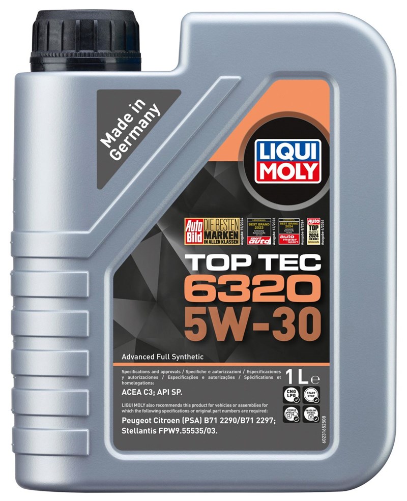 Top Tec 6320 5W-30 er primært udviklet til benzin- og dieselbiler af typen Citroën, DS, Fiat, Jeep, Opel, Peugeot og Toyota med PSA-motorer. LIQUI MOLYs nyeste motorolie er egnet til motortyper der kræver et smøremiddel med specifikationen Stellantis FPW9.55535/03, PSA B71 2290, PSA B71 2297 samt ACEA C3 og API SP.