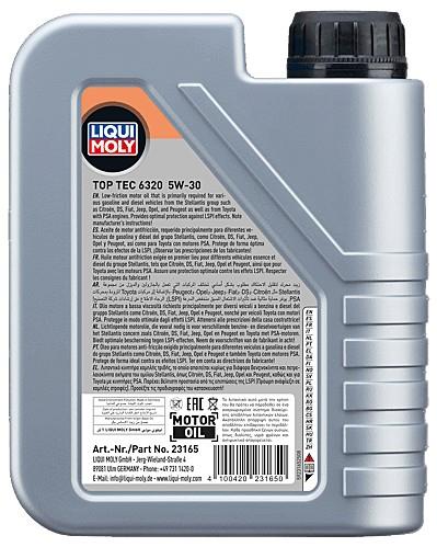 Denne Liqui Moly olie en del af Premium olierne fra tyske Liqui Moly. Olien er baseret på syntetiske additivpakker som resulterer i en moderne brændstofeffektiv olie, udviklet til brug gennem hele året til i særdeleshed biler med små højtydende motorer. Tendensen med færre kubik (ccm) har varet i nogle år og ser ud til at fortsætte, i takt med at kravene til bilernes forurening skærpes år for år. Det kræver en olie der smører ved både høje temperarur og ved højt tryk, netop der kommer denne Liqui Moly Top Tec 6320 ind i billedet. Olien beskytter mod slidtage under alle kørestile og temperaturer og medvirker til lavt brændstofforbrug.