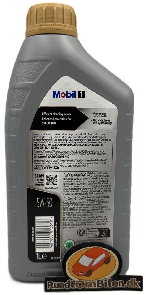 Olien er en syntetisk motorolie med topavanceret ydeevne udviklet til at minimere slitage i din bils motor. Mobil 1 5W-50 Rally Formula overholder eller sågar overgår bilproducenters krav til standarderne til højtydende turboladede, trykladede benzin- og dieselmotorer med brændstofindsprøjtning. Mobil 1 5W-50 erspecielt godt egnet til motorer der ofte kører ved høje omdrejninger. Dette også til biler der ofte starter og standser (Bykørsel).
