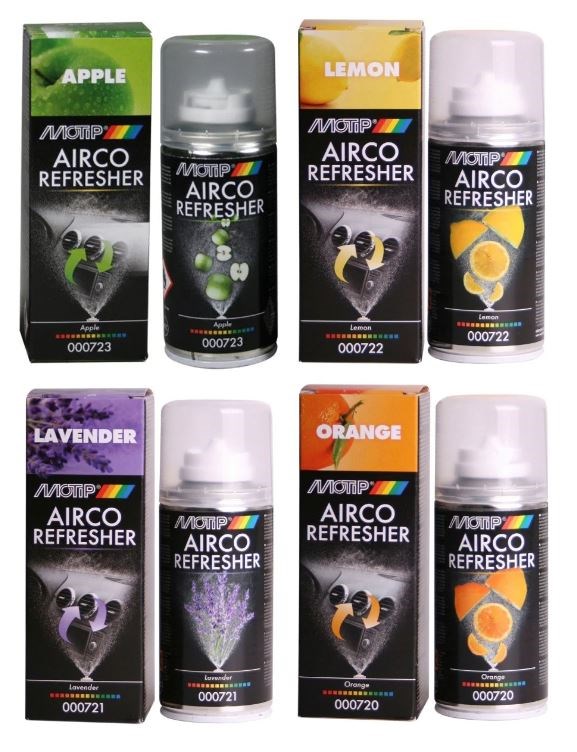 Motip laver aircondition rens/opfrisker med 4 forskellige dufte (appelsin, citron, lavendel og æble). Mange bilers airconditionsystem opsamler over årene dårlig lugt i rør og luftkanaler, for at få denne lugt fjernet, anbefales det én gang om året at opfriske systemet med en airconrens. De fire typer fra Motip sikrer at ubehagelige lugte fra systemet fjernes og efterlader bilen med en subtil frisk duft.