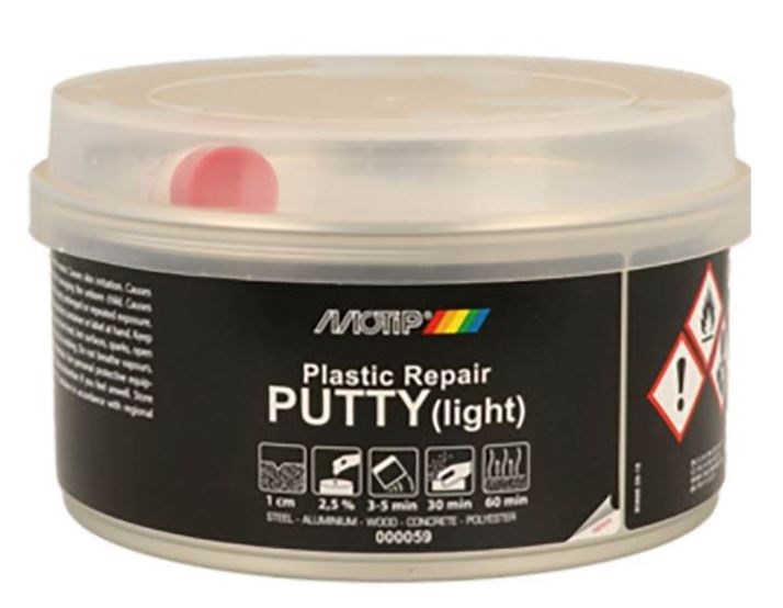 Plast reparationspartel er meget elastisk og let at slibe. Plast reparationspartel kan omsprayes med alle malinger, også pulverlakering, og har en meget fin struktur. Plastreparationsspartel er modstandsdygtig over for kemikalier og vejrpåvirkningerog har fremragende vedhæftning. MOTIP Plastic Repair Kit kan påføres i lag med en tykkelse op til 1 centimeter.