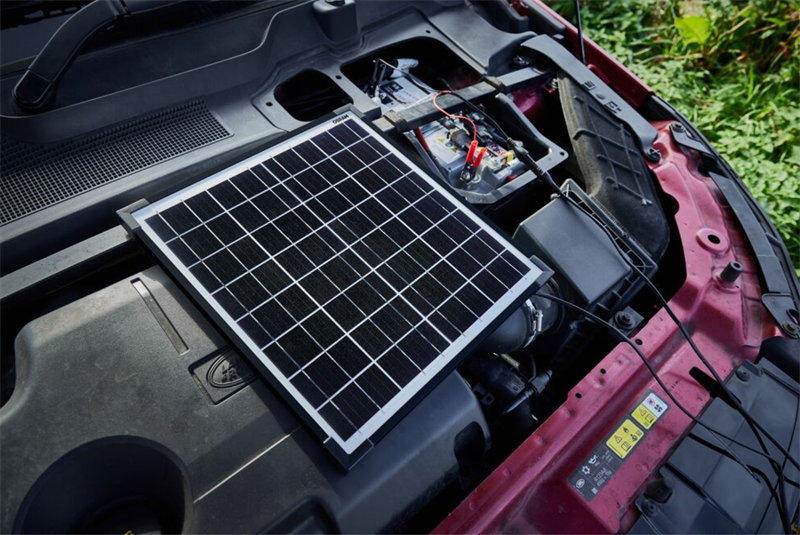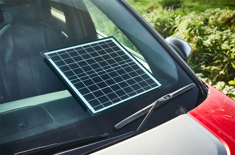 Laderes tilsluttes nemt bilens batteri med de medfølgende ledninger og solcelle panelet placeres f.eks i forruden.