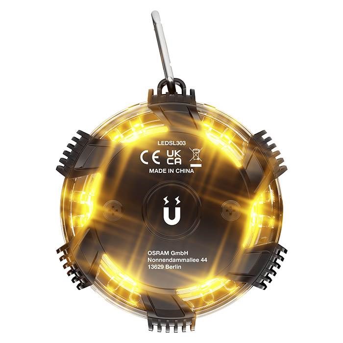 I alt 16 højkvalitets LED'er med lang levetid tilbyder tre forskellige driftstilstande: 360° roterende orange advarselslysfunktion, permanent orange lysfunktion og en hvid lommelygte funktion. Med de tre medfølgende AAA-batterier advarselslampen er klar til brug. Batterilevetid: Blinkende advarselslys op til 20 timer, permanent advarselslys op til 15 timer, lommelygte op til 8 timer.