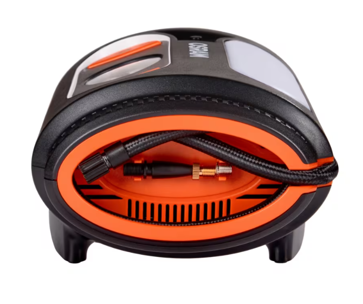 Strømkablet der passer i cigartænderen på bilen er 3 meter langt, så du nemt kan nå rundt om hele bilen, og det rulles nemt op med håndtaget bag på kompressoren.