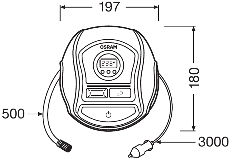 Strømkablet der passer i cigartænderen på bilen er 3 meter langt, så du nemt kan nå rundt om hele bilen.
