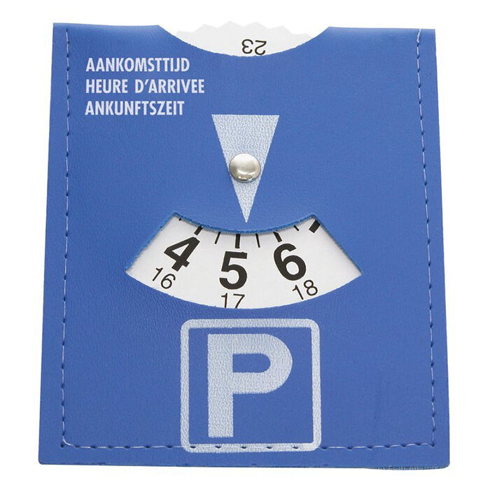 Praktisk parkeringsskive i lomme, som er nem at lægge op og tage ned fra forruden. P-skiven måler 17 x 12 cm og er blå med hvid skive og sorte tal. Nemt at indstille ankomsttiden ved hjælp af skiven med tidsangivelse. Ved parkering drejes skiven til ankomsttidspunktet, dette gøres hver halve time. Placer skiven under forruden. Med hollandsk, tysk og fransk tekst.