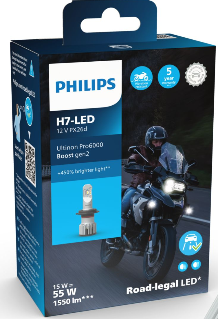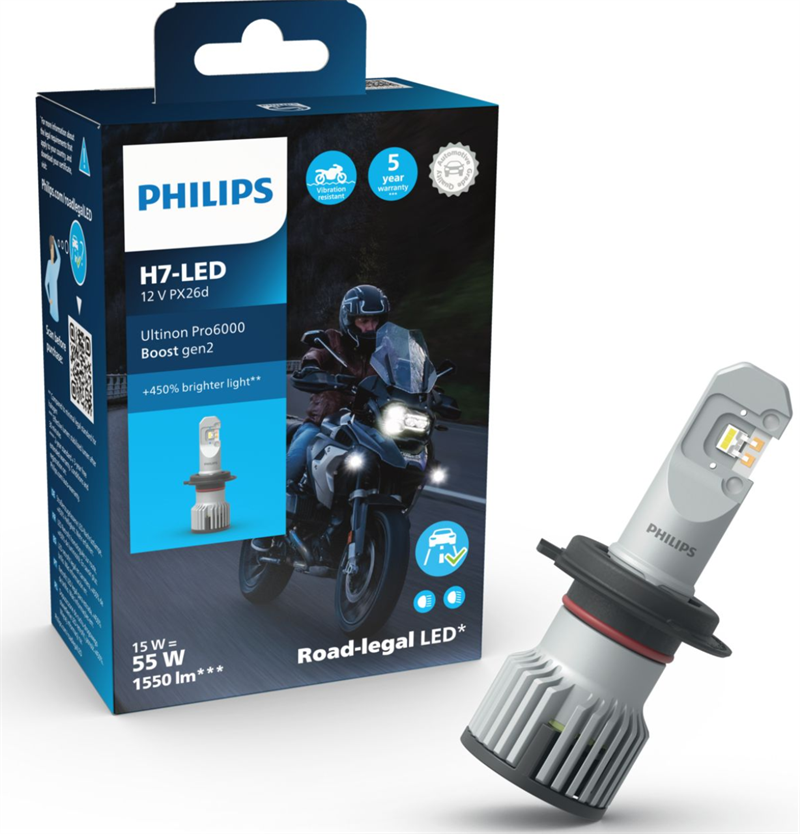 Philips Pro6000 BOOST Gen2 Ultinon ECE Godkendt LED H7 pære til MC +450%