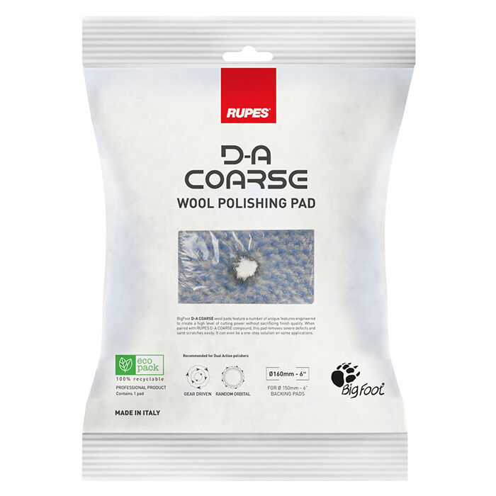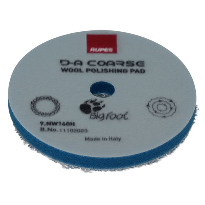 Grove uldpolerpuder fra Rupes, designet til dual action-værktøjer, er specielt fremstillet til effektivt at fjerne alvorlige lakfejl. Den grove uldpudes blå skum er både mere stift og tæt, hvilket øger overførelsen af værktøjets bevægelse til arbejdsfladen og dermed øger skærekraften.