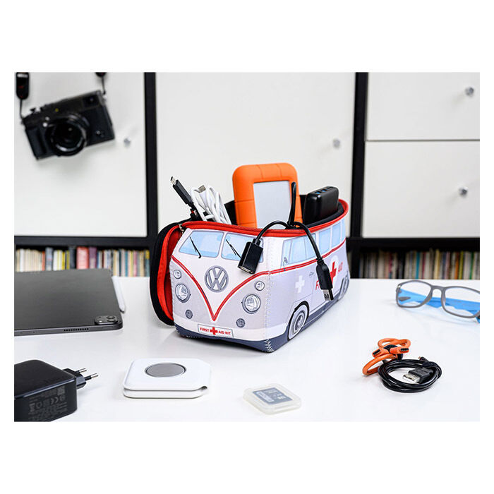 Unik universal toilettaske / kosmetiktaske lavet af blød neopren og formet som VW T1 ambulance i grå. Tasken er multifunktionel og kan anvendes som: