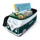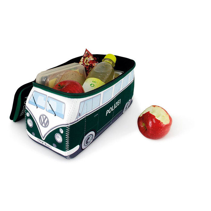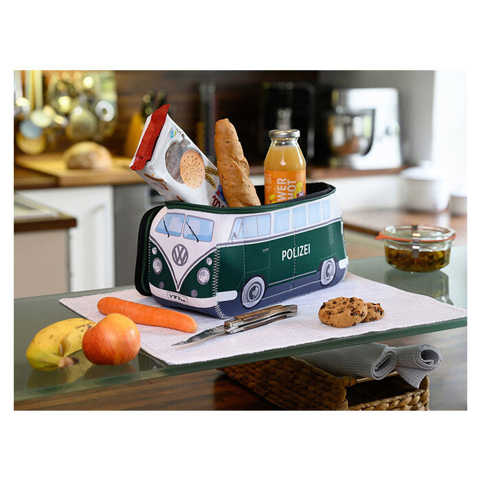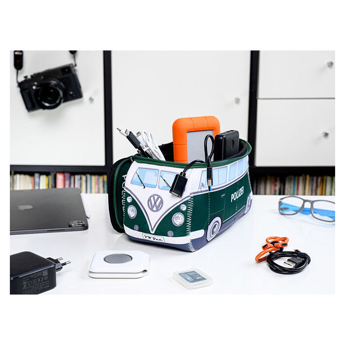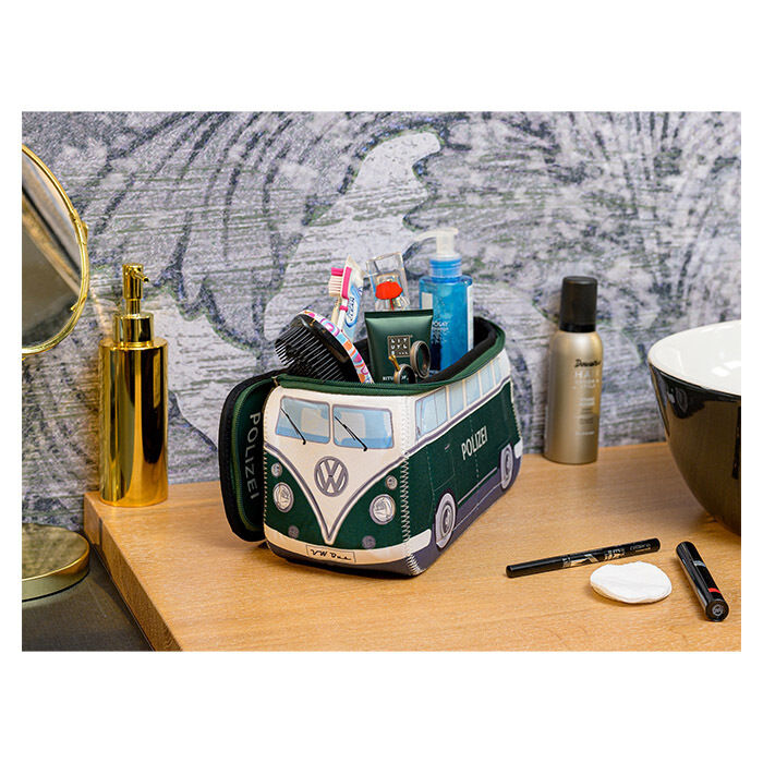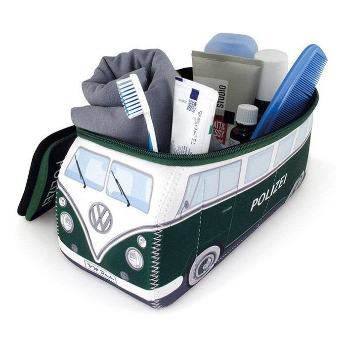 Unik universal toilettaske / kosmetiktaske lavet af blød neopren og formet som VW T1 politibil i mørkegrøn. Tasken er multifunktionel og kan anvendes som: