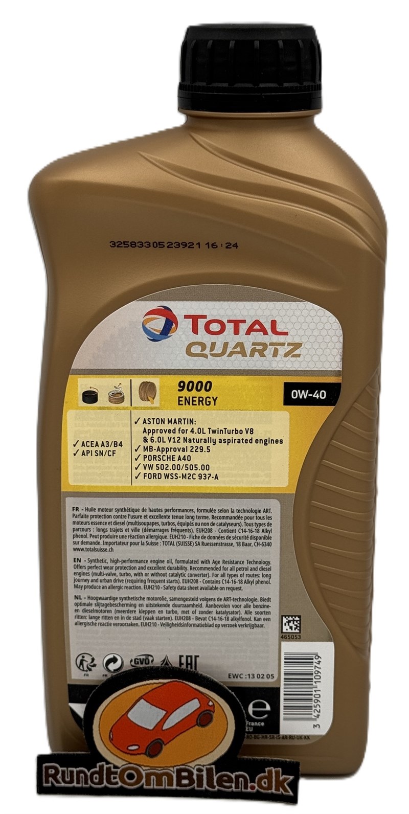 Denne syntetiske motorolie er meget velegnet til alle typer af benzin og dieselmotorer, især nyere modeller med/uden turbolader, multiventilede (f.eks. 16v motorer), direkte indsprøjtning og katalysator. Total Quartz 9000 Future er fuldt ud tilpasset til alle typer brugsbehov, også de ekstreme. Dette være sig både meget korte byture, dvs. "stop & go" kørsel, lange motorvejsture mm. Motorolien er formuleret med Total's Age Resistance Technology som holden oline frisk og med høj smøreevne længere end mange andre olier.