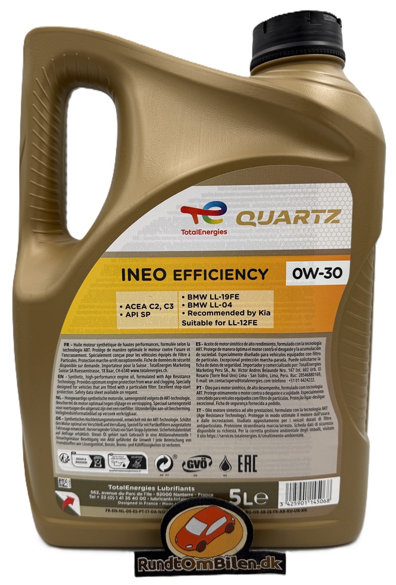 Total 0W30 Quartz Ineo Efficiency er udviklet specielt til BMW og Kia efter deres fabriksnormer. Olien er en af få der bærer to BMW specifikationer (LL-19FE og den klassiske LL-04).
