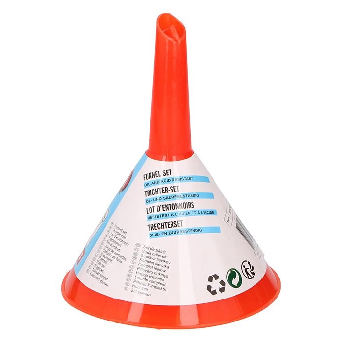 Uanset om du skal påfylde olie, sprinklervæske, kølervæske eller andet, er det rart med en tragt i den rigtige størrelse så du ikke spilder. Med dette tragtsæt får du fire tragte i forskellige størrelser, der dækker forskellige behov. Den orange farve gør dem nemme at få øje på, og de passer ind i hinanden, så du kan holde bilen eller garagen ryddelig.