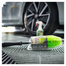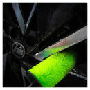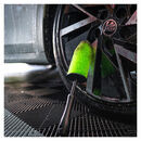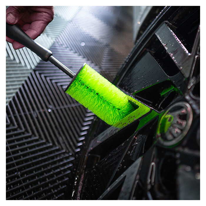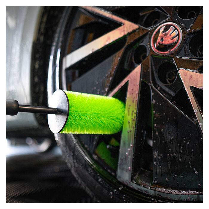 Spray fælg rens på fælgene, drej hjulet 180°, og spray igen for fuld dækning. Løs snavset med børsten, lad det virke i 3–5 minutter, og skyl grundigt med vand.