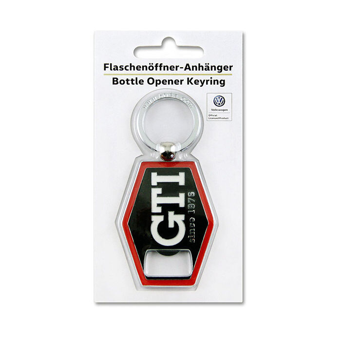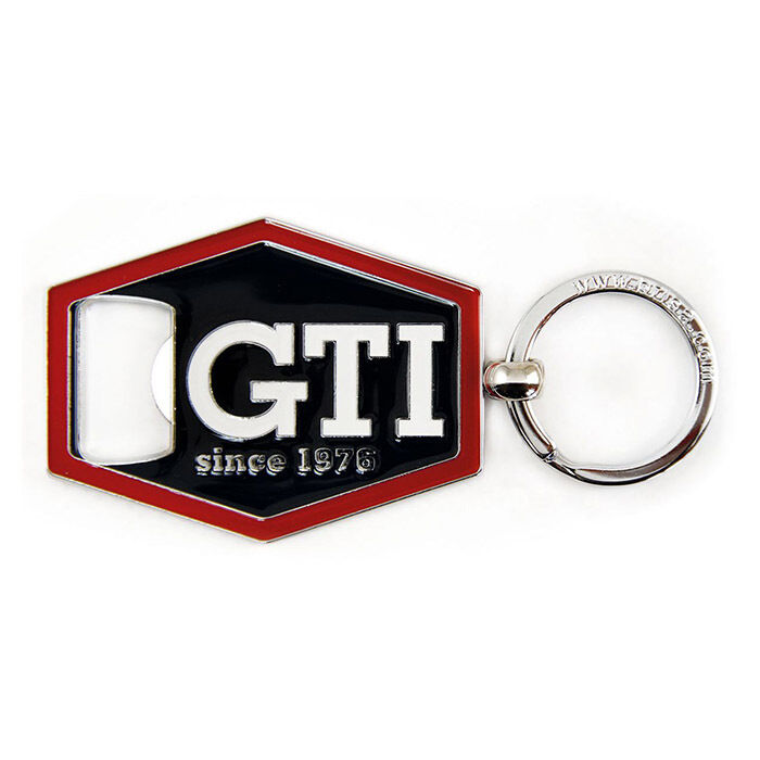 VW GTI nøglering med integreret oplukker. Ikke nok med at denne nøglering dekorerer dine nøgler, den kan også åbne kapsler på ingen tid. Nøgleringen er sekskantet og med GTI logo og oplukker i enden.