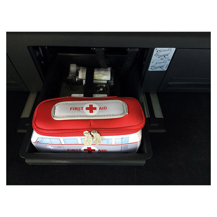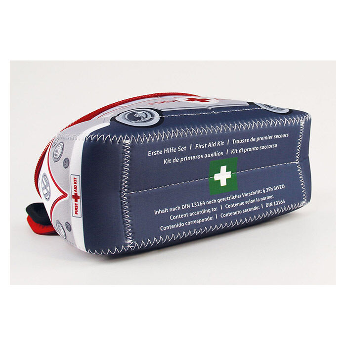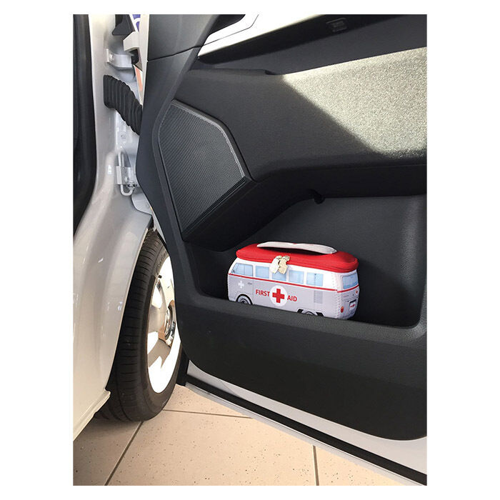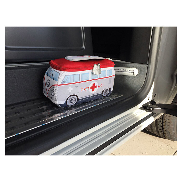 Toilettaske / kosmetiktaske lavet af blød neopren og indeholder førstehjælpskit. Tasken er formet som en VW T1 ambulance. Perfekt til rejser og roadtrips i bil, autocamper eller motorcykel.